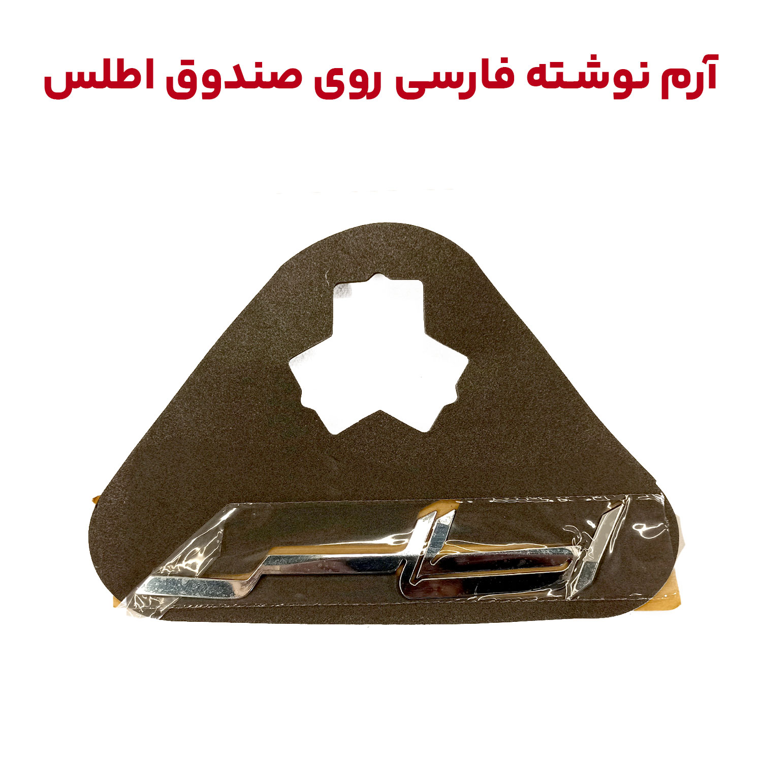 بر اساس مصوبه مجلس شورای اسلامی خودروسازان ایرانی الزام به درج نام فارسی خودروها را دارند. از این رو در خودرو اطلس هم در بخش صندوق شاهد یک آرم نوشته فارسی از نام اطلس هستیم که در مرکز صندوق عقب خودرو نقش بسته است. این آرم از جنس پلاستیک ABD است که روکشی از آبکاری کروم روی آن نقش بسته است. کیفیت آرم فارسی اطلس این محصول دقیقا مشابه محصولی است که در خط تولید سایپا مورد استفاده قرار میگیرد. این آرم از جنس پلاستیک تولید شده است که روی آن آبکاری دقیق و بی عیب و نقصی ایجاد شده است. در پشت آرم چسب آماده نصب و استاندارد خودورسازی قرار گرفته که به خوبی روی بدنه خودرو مینشیند