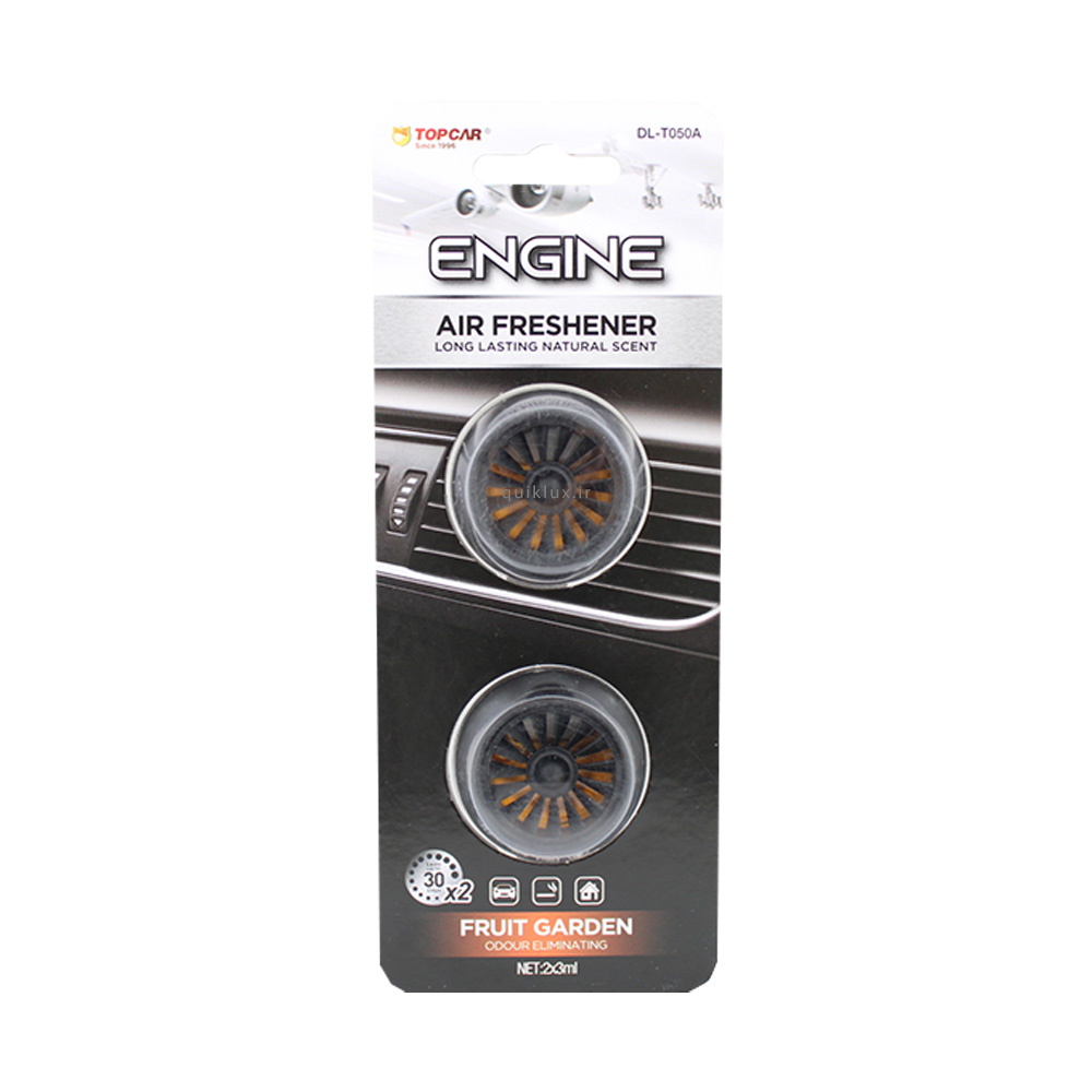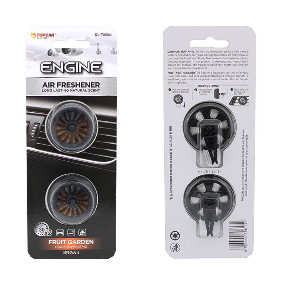 شرکت تاپ کار یک شرکت با سابقه درخشان در زمینه تولید خوشبو کننده خودرو میباشد که کیفیت محصولاتش همیشه در رده اول میباشد . محصول مورد نظر جهت نصب در دریچه کولر انواع خودرو طراحی شده است . در این محصول ۲ عدد خوشبو کننده موجود است که طرح موتور هواپیما را دارد که باعث جذابیت بسیار زیاده آن شده است . این محصول قابل تنظیم جهت پخش بو میباشد . این محصول به دلیل استفاده از برترین اسانس های روز دنیا با کیفیت ترین خوشبو کننده را ارائه میدهد . همچنین پایه نصبی این محصول قابلیت چرخش ۳۶۰ درجه را دارد به همین علت قابل نصب روی تمام دریچه کولر ها میباشد