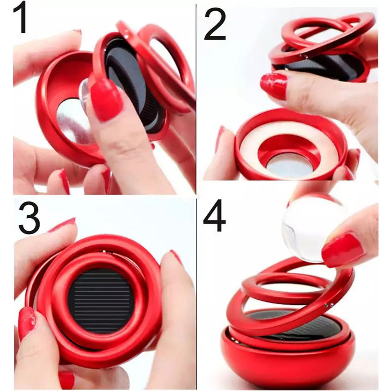 محصول خوشبو کننده خوردرو مدل خورشیدی ترکیبی از یک خوشبوکننده و یک گوی چرخشی است که هم جنبه کاربردی داشته و هم میتواند یک المان زیبایی روی داشبورد خودرو شما محسوب شود. این محصول به کمک پنل خورشیدی که دارد در طول روز بدون نیاز به هیچ گونه باتری شروع به چرخش می کند و یک حرکت زیبا را در جلوی چشمان شما به نمایش می گذارد.