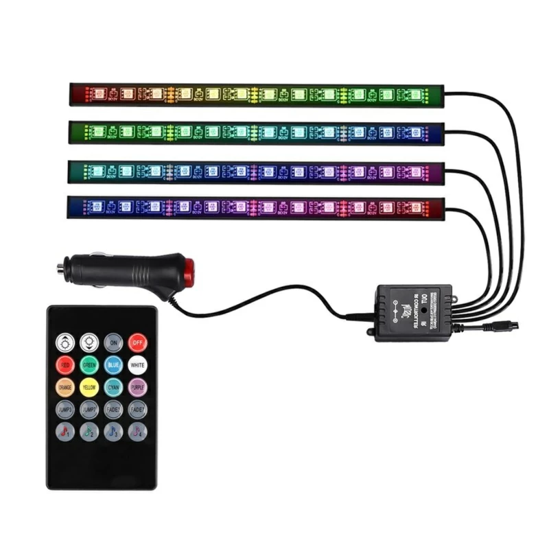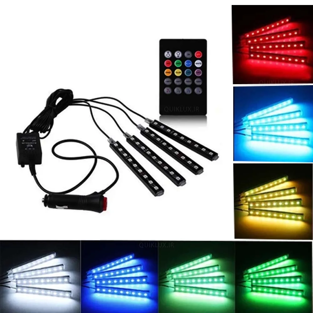 اتمسفر لایت زیر پایی ریموت دار شامل چهار شاخه LED جهت نورپردازی و رقص نور زیر صندلی خودرو می باشد ، این مدل کیت نورپردازی داخل ماشین به همراه یک عدد ریموت کنترل جهت خاموش و روشن کردن لامپ ، کم و زیاد کردن نور لامپ، تغییر رنگ لامپ ( ۸ رنگ مختلف )، تغییر مد رقص نور ( ۴ مدل مختلف ) و همگام سازی با موزیک ( ۴ مدل مختلف ) می باشد.