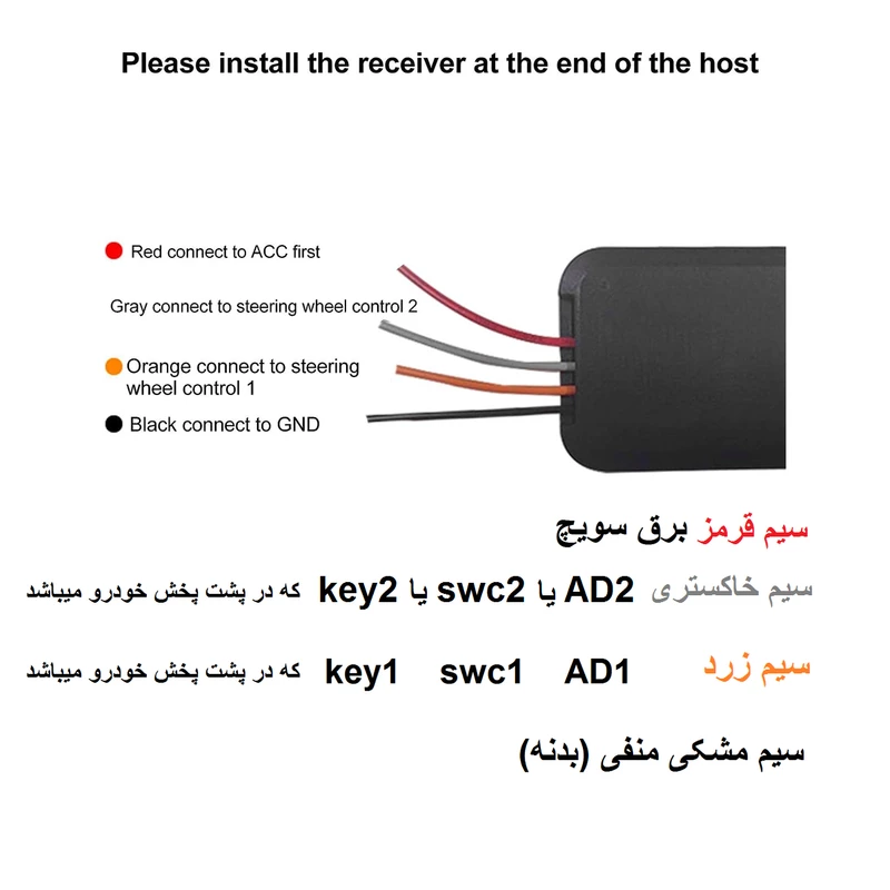 بوسیله این ریموت کنترل میتوانید بدون نیاز به سیم کشی و تغییرات سخت افزاری در خودرو،کنترل مالتی مدیا خودرو خود را بدست بگیرید. شما با 6 کلید و 6 فرمان آسایش و امینت در هنگام رانندگی خواهید داشت. تنها نیاز به دو سیم در پشت مالتی مدیا خودرو خود دارید که معمولا در مانیتورهای بروز (سیستم عامل اندروید یا ویندوزCE) این دو کابل موجود است.به نام های KEY1 , KEY2 بعد از نصب به سراغ گزینه Steering Learn یا تعریف کلید های فرمان خودرو ، در سیستم مالتی مدیا خودرو خود شوید و شروع به تعریف کلیدهای ریموت نمایید. لطفا قبل از خرید سیم های key1 یا swc1 یا AD1 و سیم key2 یا swc2 یا AD2 را در پشت مالتی مدیا چک کنید در صورت وجود سیم های نام برده ریموت قابل استفاده میباشد سیم های ذکر شده در سیستم های اندروید موجوده و در سیستم های ویندوز و پایونر و …. چک شود